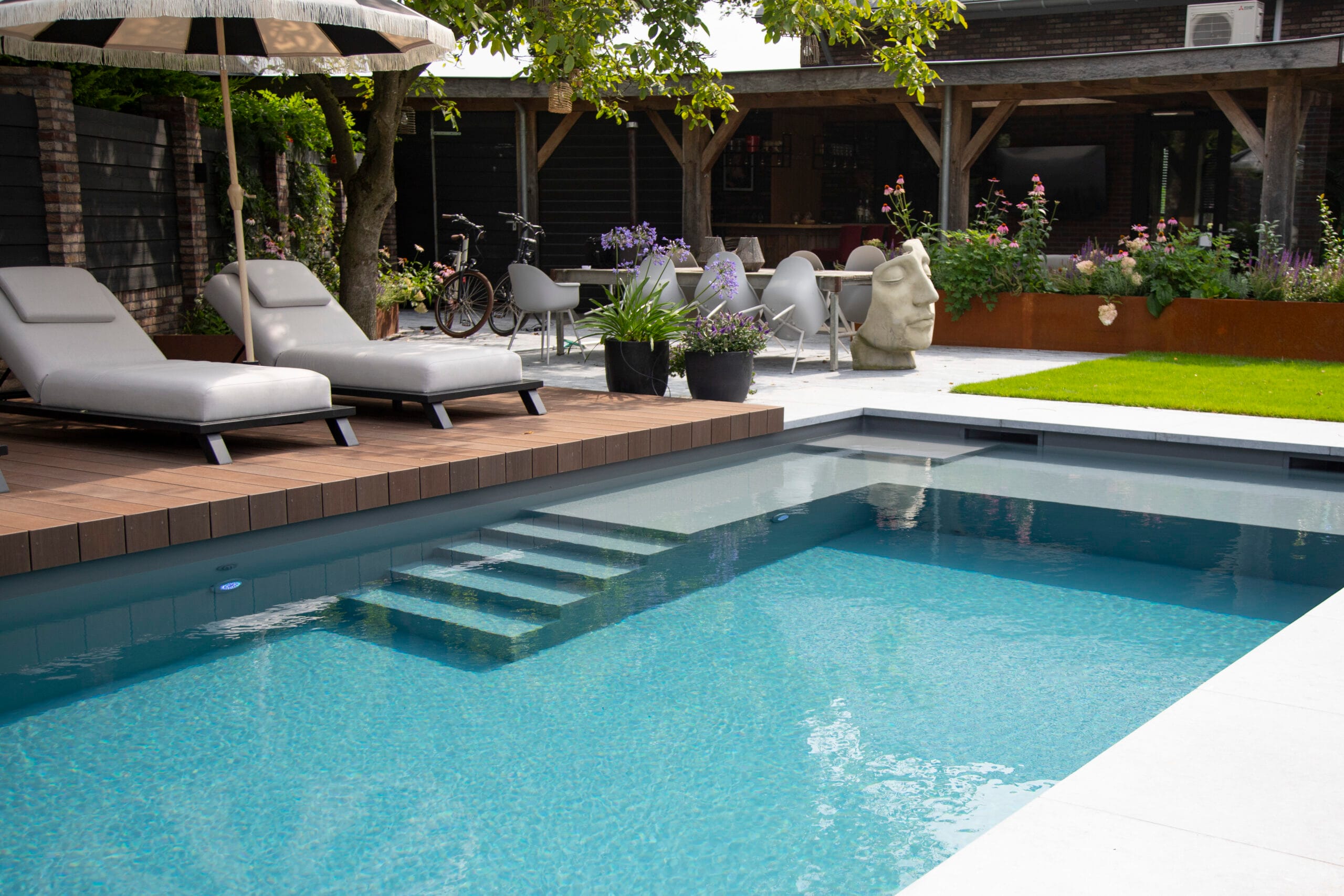 Project Best is een mooi en praktisch zwembad. Het biedt veel mogelijkheden dankzij het grote, verdiepte ligplateau, wat zorgt voor extra comfort en gebruiksgemak.